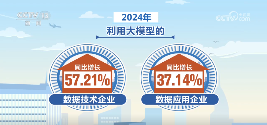 2024年,我國開發或應用人工智能的企業數量同比增長36%,高質量數據集數量同比增長27.4%,有力支撐人工智能訓練和應用。利用大模型的數據技術企業和數據應用企業同比分別增長57.21%、37.14%。