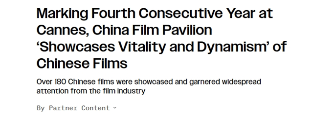 當地時間5月15日,美國《綜藝》雜誌發表文章,題為:亮相戛納國際電影節,中國電影聯合展台“展現中國電影的生機與活力”。