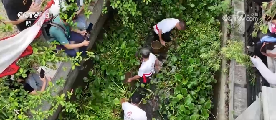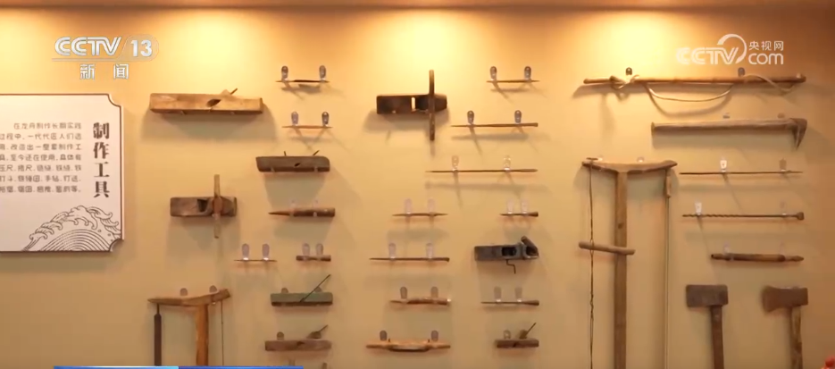 記者來到廣東佛山鹽步老龍起水的現場,593歲的老龍船在這裏起水。起龍人下水後,首先將船身內的水滔幹,包括除淤。以前龍船都是埋在河涌下淤泥上保存,而現在村裏人給龍船做了一個龍牀,也就是水泥硬化基底,在啓龍的時候只需抽乾滔幹水就可以了。記者手上的物品就是老龍出水需要的工具,勺子是清水用的工具,清水後要用到藤絲清泥。