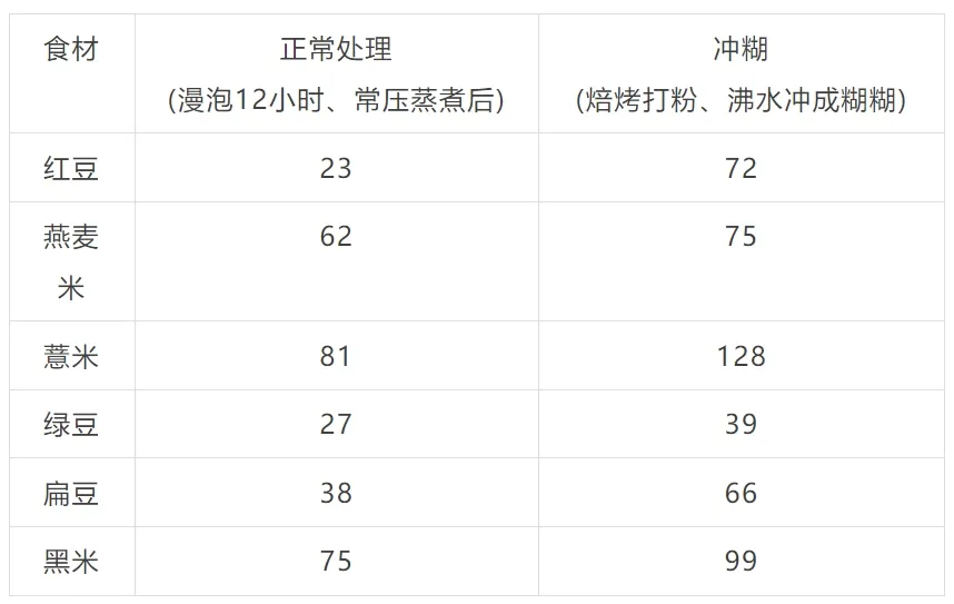 從以下表格可以看到,粗糧打粉後GI普遍升高,有些食物直接從低GI變成高GI食物。