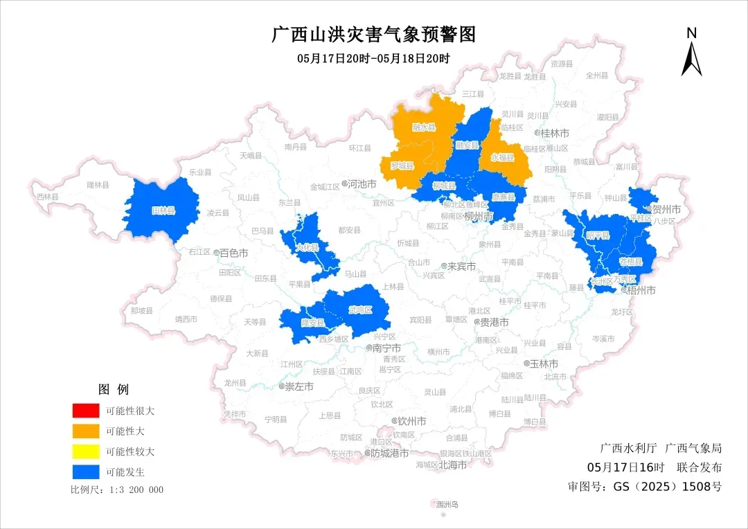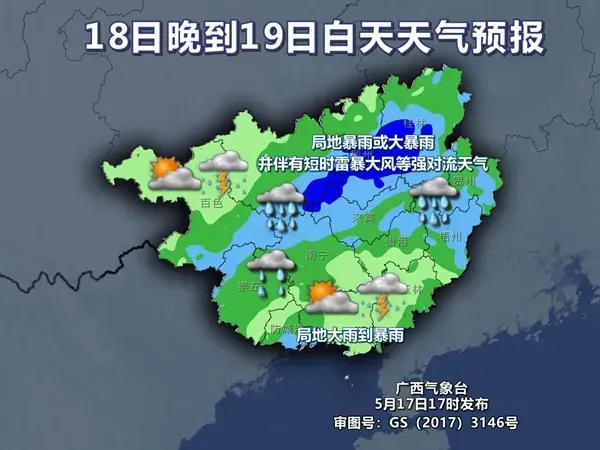 18日晚上到19日白天,桂北、桂中有大雨、局地暴雨或大暴雨並伴有短時雷暴大風等強對流天氣,其他地區多雲到陰天有陣雨或雷雨、局地大雨到暴雨。