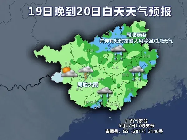 19日晚上到20日白天,桂北、桂東和沿海的部分地區有中雨、局地暴雨並伴有短時雷暴大風等強對流天氣,其他地區多雲間陰天有陣雨或雷雨、局地大雨。