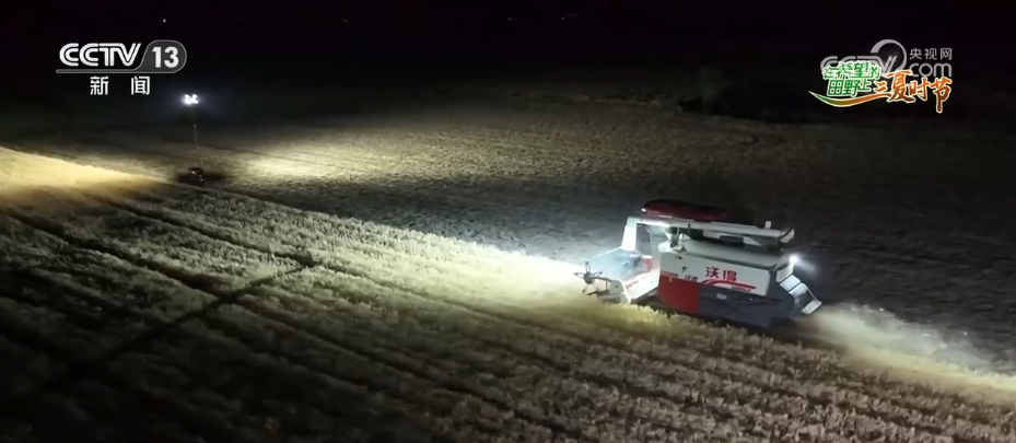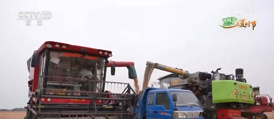 在河南南陽鄧州構林鎮這處麥田,金黃的麥浪層層鋪開,麥穗在陽光下熠熠生輝。4台聯合收割機開足馬力穿梭在麥田間,伴隨着機器的轟鳴聲,成熟的小麥被快速收割、脱粒,金黃的麥粒從收割機的出糧口傾瀉而出,裝入一旁的運輸車輛。