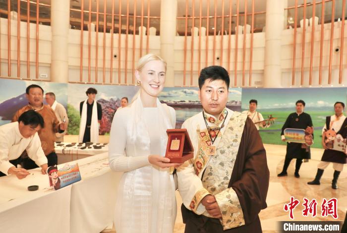 4月19日,“聖境甘南—中歐盛宴”暨甘南藏族自治州國際旅遊推介活動在陝西西安舉辦。扎西當知布(右一)受邀參加,其個人繪製的微型唐卡受到外國嘉賓的喜愛。(受訪者 供圖)