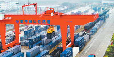 廣西南寧國際鐵路港是中國鐵路出口越南集散中心,也是中國西部陸海新通道的重要節點。圖為南寧國際鐵路港一片繁忙景象。新華社記者 周 華攝