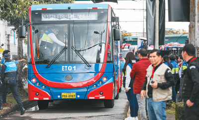 圖為在厄瓜多爾首都基多,人們體驗宇通雙源無軌電車。裏卡多·蘭德塔攝(新華社發)