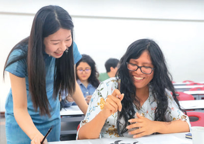 圖為在秘魯利馬,秘魯天主教大學孔子學院中文教師梁卿(左)輔導秘魯學生寫書法。瑪利亞娜·巴索攝(新華社發)