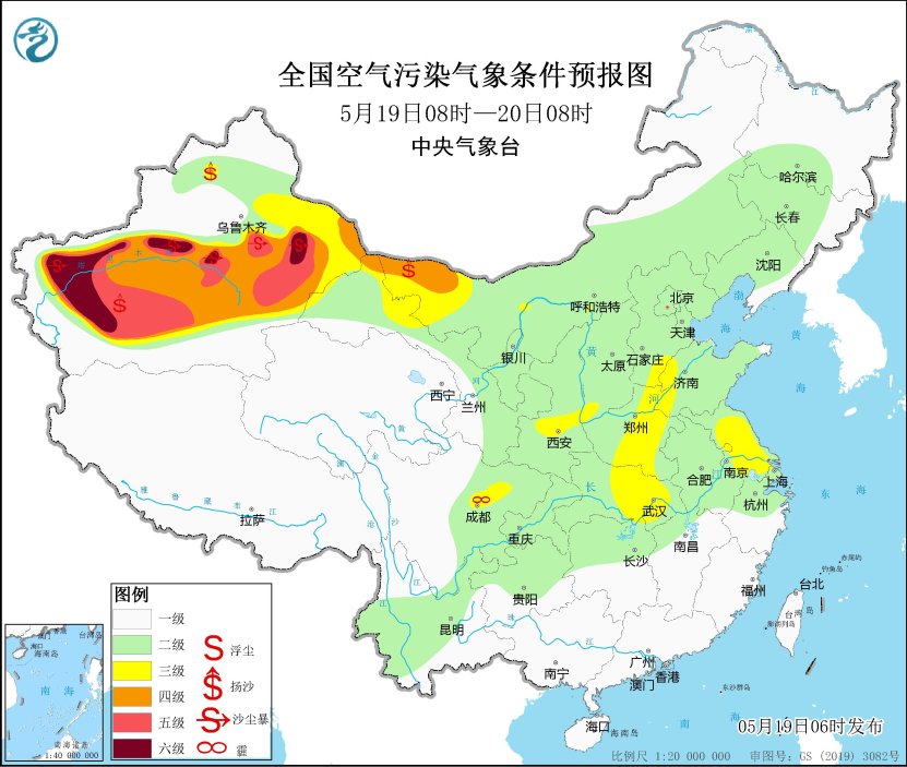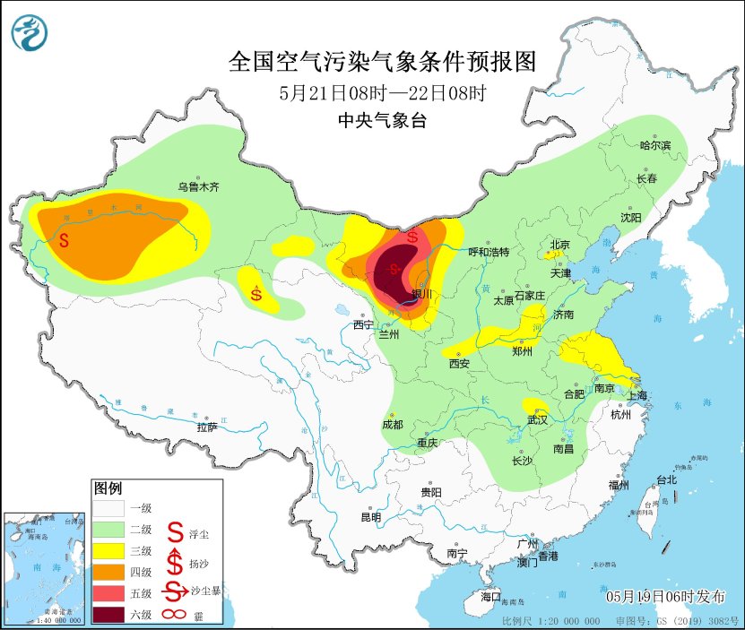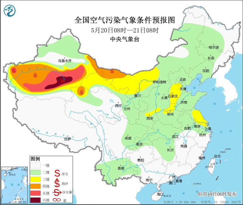 19日至21日,新疆東部和南部、青海北部、甘肅西部、內蒙古西部等地的部分地區有揚沙或浮塵天氣,其中,19日至20日,新疆南部的部分地區有沙塵暴或強沙塵暴。