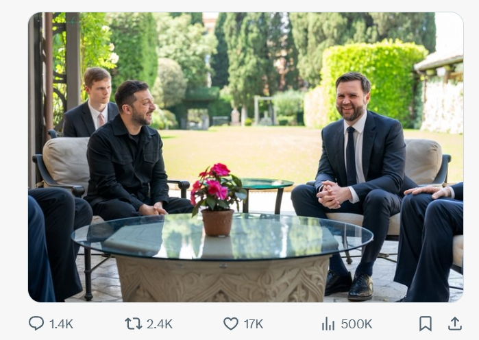 澤連斯基和萬斯在美國駐意大利大使的官邸會面,美國國務卿魯比奧在場。萬斯在社交媒體上説,他與澤連斯基討論了關於烏克蘭停火與和平談判的最新情況,還配發一張兩人面帶笑容會面的照片。