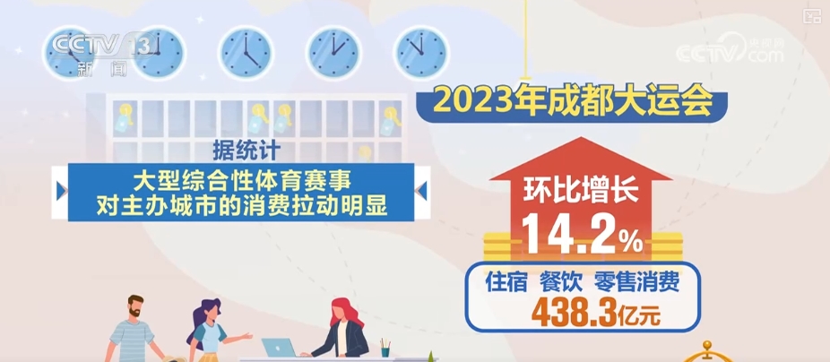 據統計,大型綜合性體育賽事對主辦城市的消費拉動明顯。2023年,成都大運會帶動住宿、餐飲、零售消費438.3億元,環比增長14.2%。杭州亞運會期間,體育及相關消費489.6億元,環比增長15.6%。