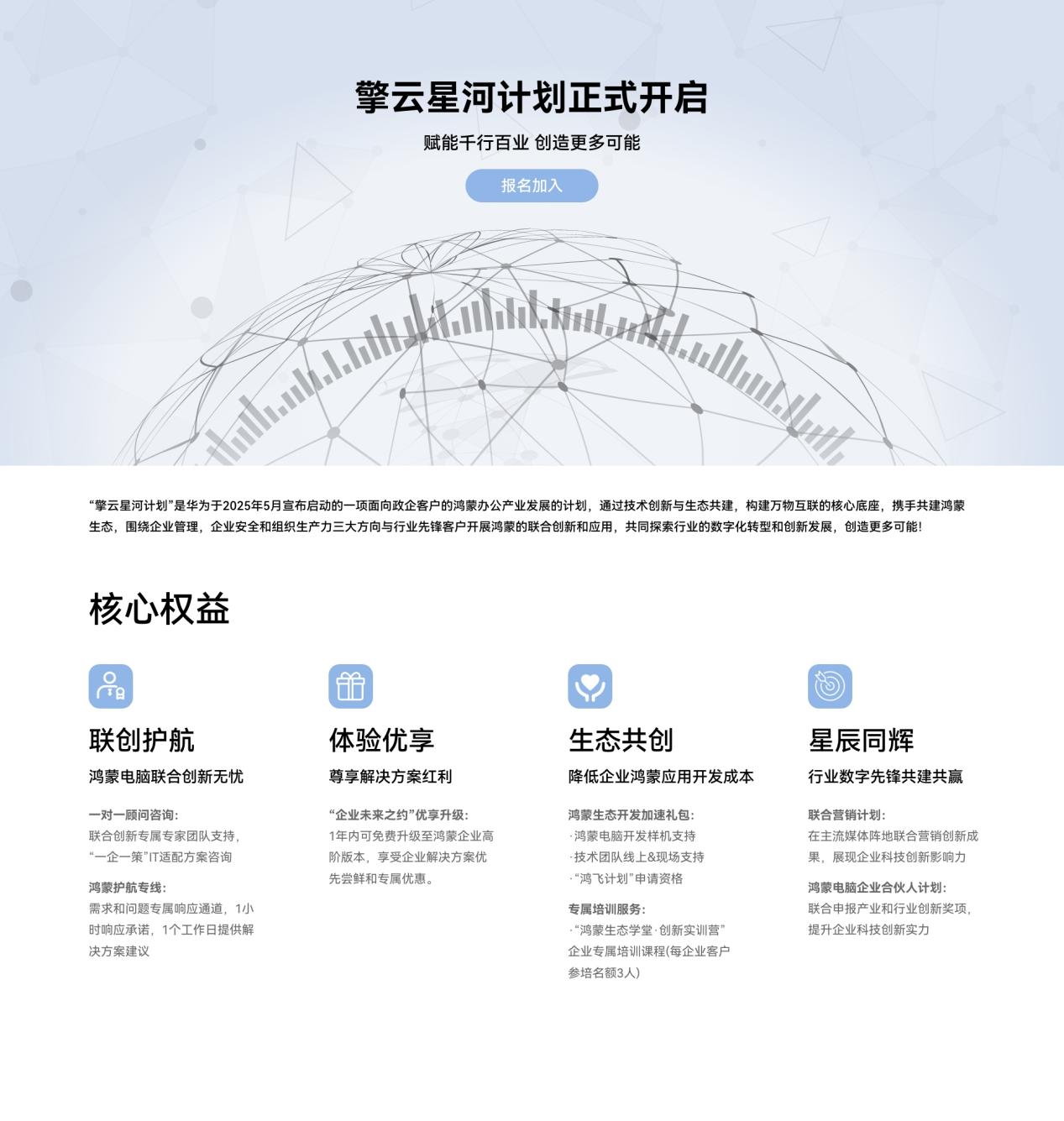 擎雲星河計劃的核心競爭力在於四大類核心權益:“聯創護航"通過"一企一策"適配方案與1小時響應機制,消除企業對新生態的技術顧慮;“體驗優享"提供1年內可免費升級至鴻蒙企業高階版本,讓企業以低成本驗證技術價值;“生態共創"的開發樣機支持與"鴻飛計劃"資格,鼓勵和吸引開發者聚焦行業場景創新,參與生態共建;營銷共贏則通過聯合營銷計劃和鴻蒙電腦企業合夥人計劃,為先鋒企業提供實際商業回報。這種"從技術驗證到商業變現"的全週期支持,將生態參與門檻從"戰略級投入"降至"項目級嘗試”。