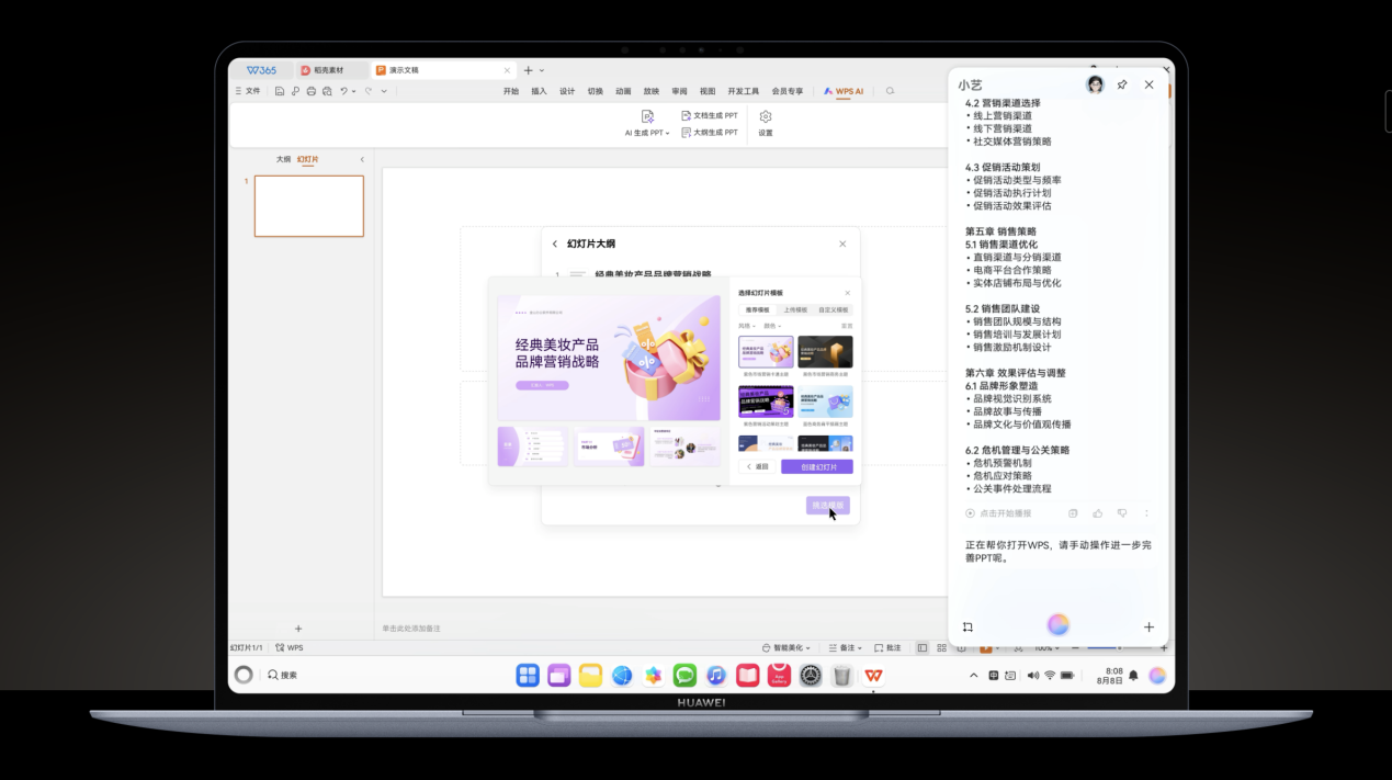 華為擎雲 HM940內置的"小藝"不再是傳統意義上的語音助手,而是通過HarmonyOS 5的底層技術重構,實現與主流辦公軟件的深度融合。在PPT製作場景中,用户只需口述主題,小藝即可自動生成邏輯清晰的大綱;表格處理時,複雜的數據透視表操作可通過自然語言指令完成。這種"AI即服務"的模式,將原本需要專業技能的操作門檻降至"一句話"層級,重新定義了人機協作的效率邊界。