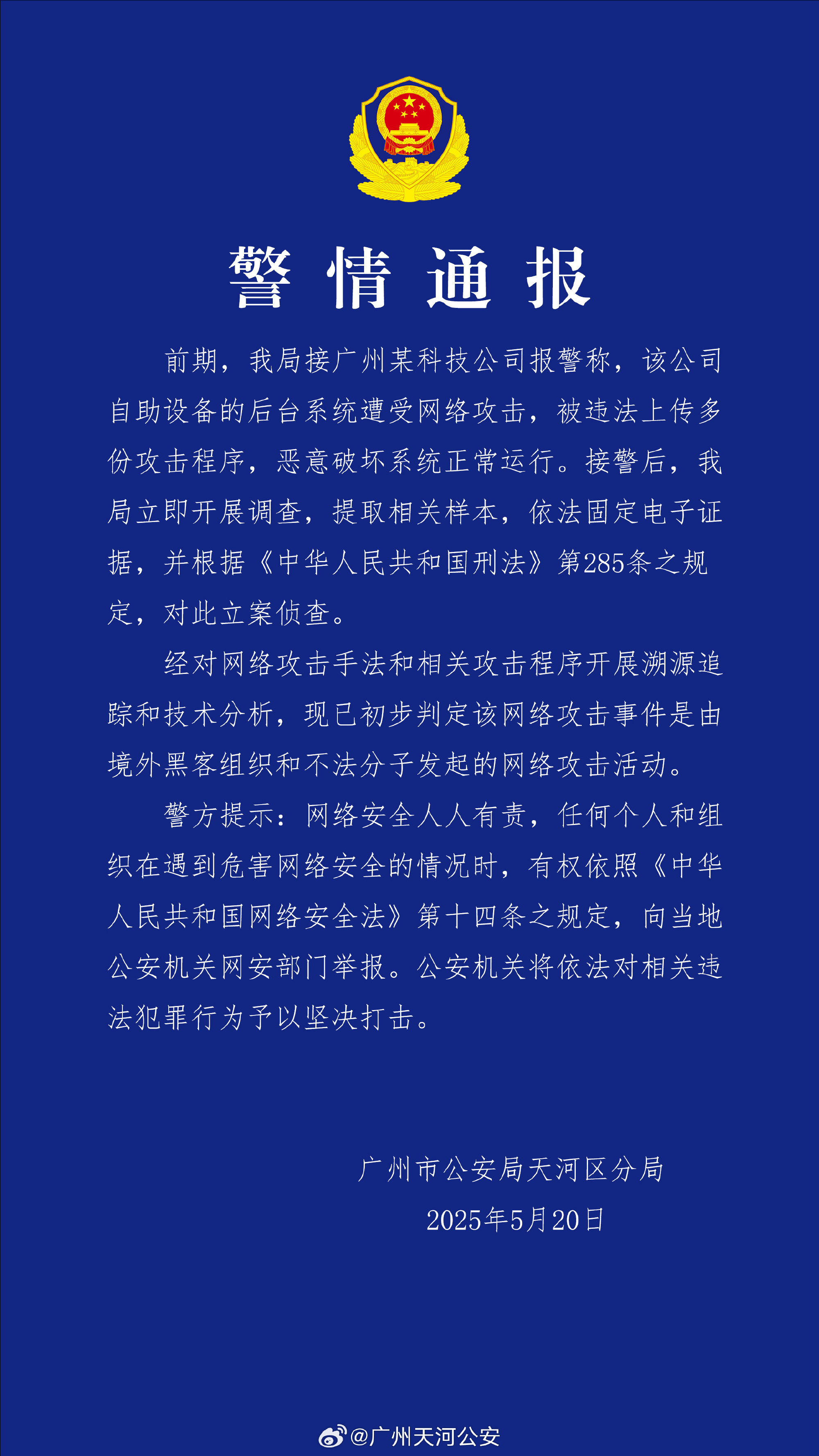 廣州市公安局天河區分局表示,該網絡攻擊事件不僅侵犯了企業的合法權益,也嚴重威脅到我國網絡空間秩序和公眾利益。