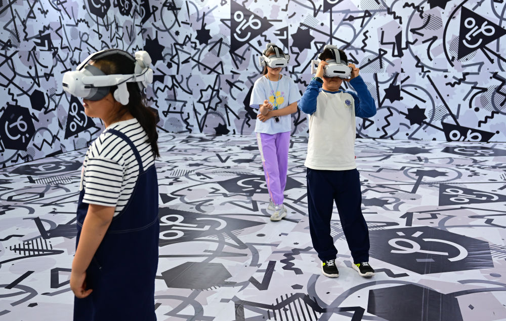 4月26日,小朋友們在第三屆中國(安徽)科技創新成果轉化交易會上體驗VR設備。新華社記者 周牧 攝