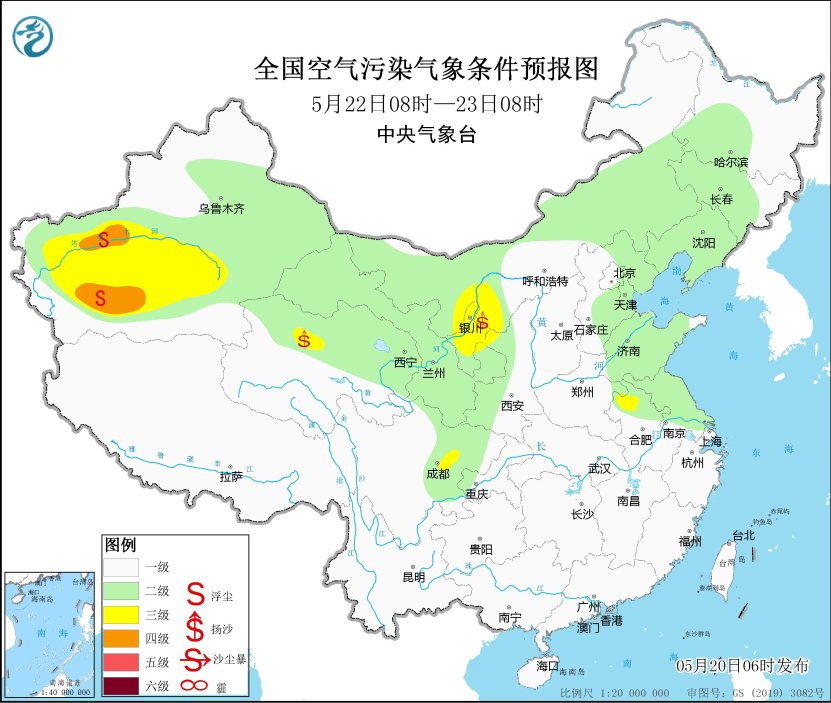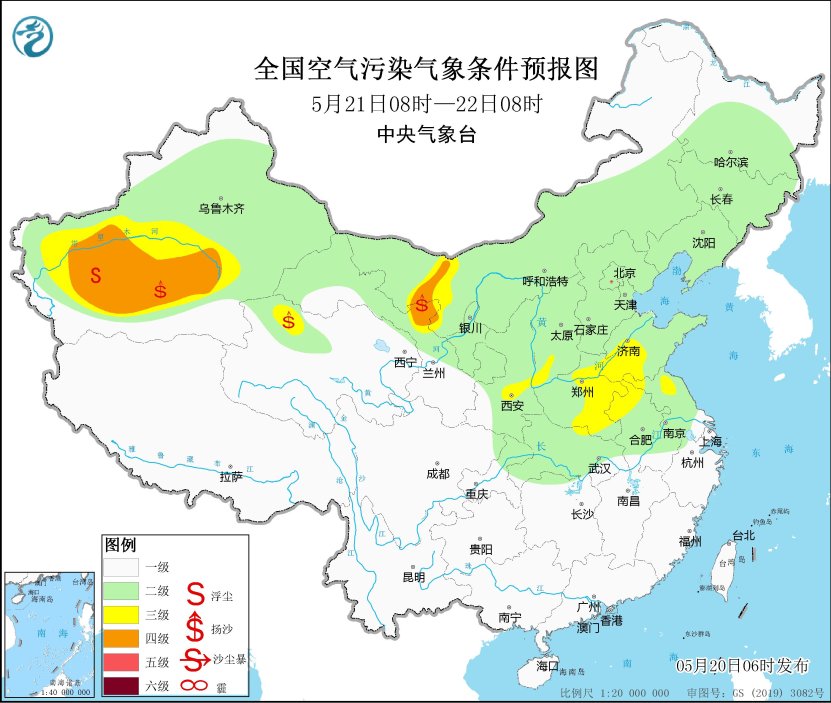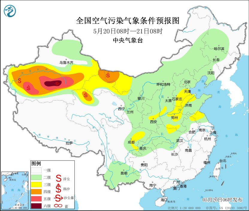20日至21日,新疆南部、青海北部、甘肅西部、內蒙古西部等地的部分地區有揚沙或浮塵天氣;其中,20日,新疆南部局地有沙塵暴。