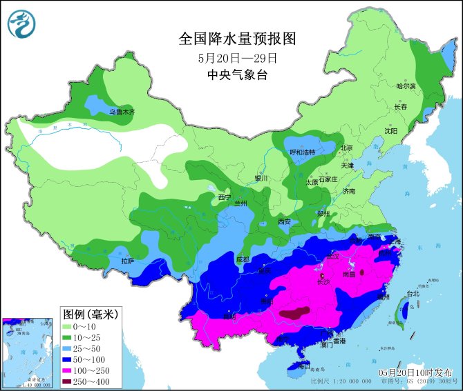 未來10天(5月20-29日),江漢東部、江南、華南及貴州、雲南等地累計降水量有60~100毫米,其中江南、華南及雲南南部等地部分地區有120~200毫米,局地超過300毫米;上述大部地區降水量較常年同期偏多3~7成,部分地區偏多1~2倍,我國其餘大部降水較常年同期偏少或接近常年。