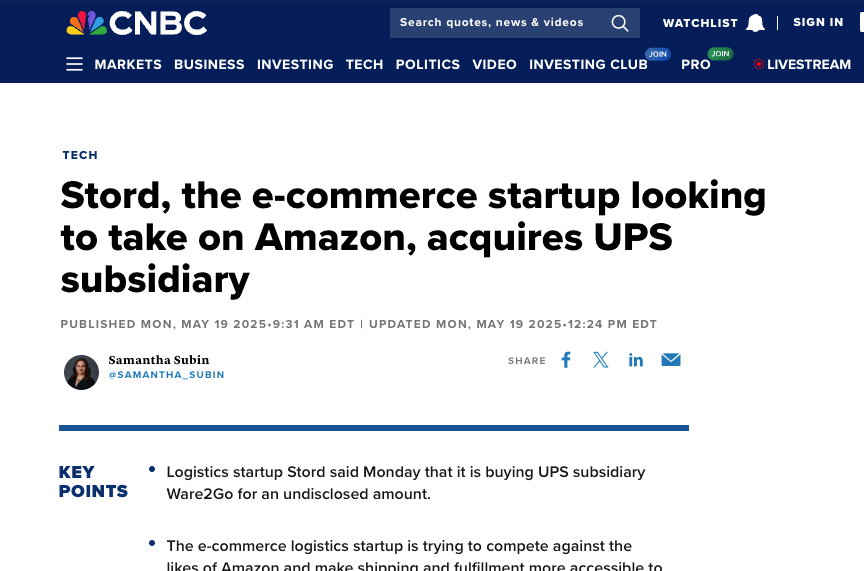 資料顯示,Stord由泰爾獎學金得主肖恩·亨利創立,總部位於亞特蘭大,其核心業務是通過雲技術平台為品牌商提供端到端的全渠道履單、倉儲及運輸服務。此次收購的Ware2Go則專注於為中小商户提供快速配送解決方案,其服務網絡覆蓋全美,並支持“按需付費”的靈活合作模式。