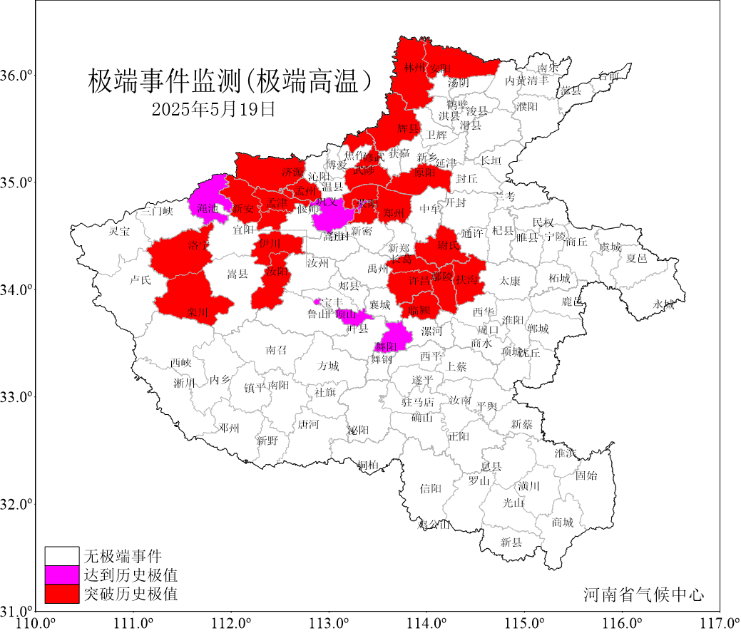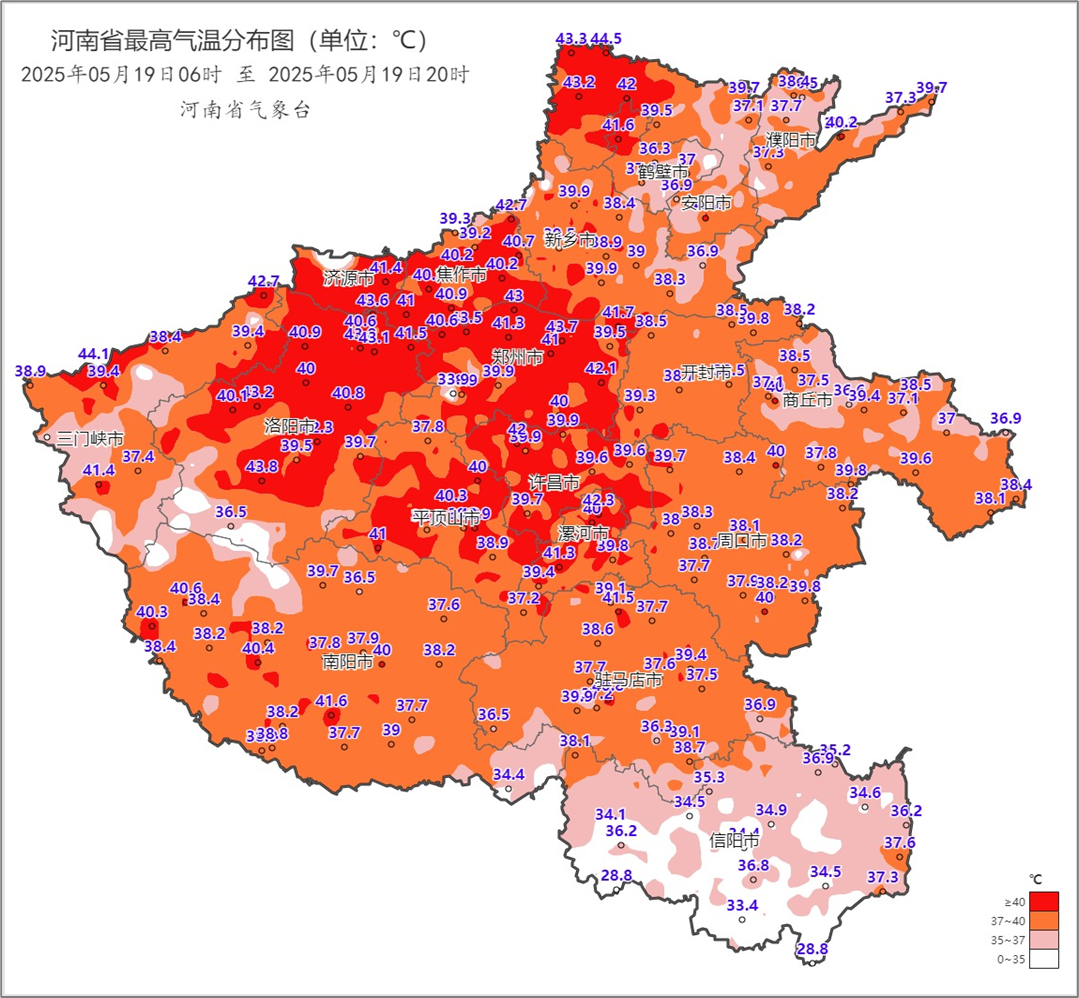 昨天我省淮河以北大部37℃以上,中西部、西北部40~43°C,林州、安陽、濟源、鄭州等23個國家級氣象站日最高氣温突破5月曆史極值,酷熱程度同期罕見。