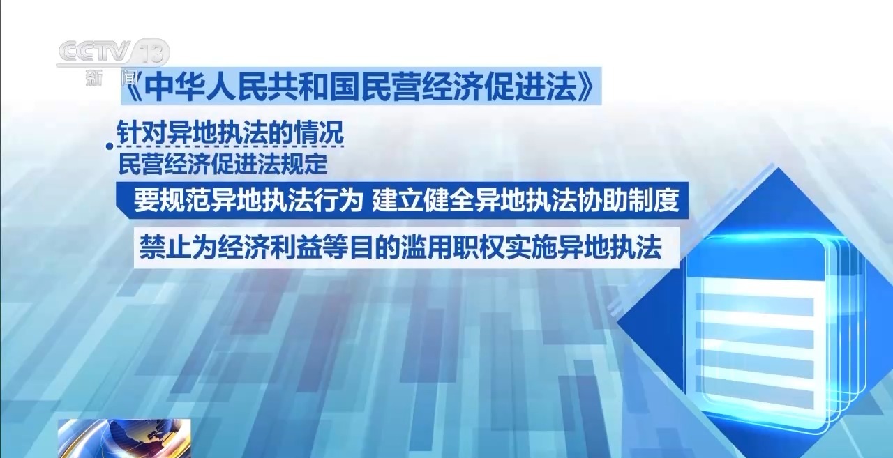 針對異地執法的情況,民營經濟促進法規定,要規範異地執法行為,建立健全異地執法協助制度。辦理案件需要異地執法的,應當遵守法定權限、條件和程序。禁止為經濟利益等目的濫用職權實施異地執法。