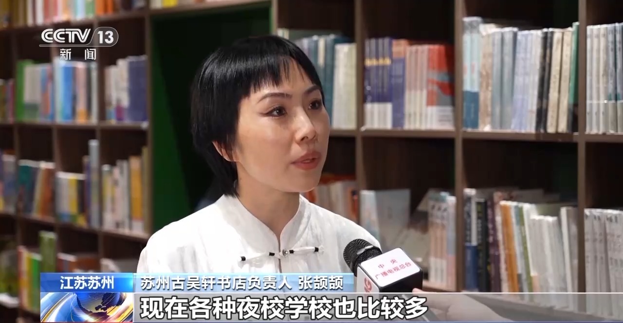 蘇州古吳軒書店負責人張頡頡*:*現在各種夜校學校也比較多,我們當時開的時候也是在忐忑中探索,因為我們是小班制,希望給到老師學生都是沉浸式的教學、沉浸式的學習。我們目前開設30個課程以來,基本上是班班報滿。