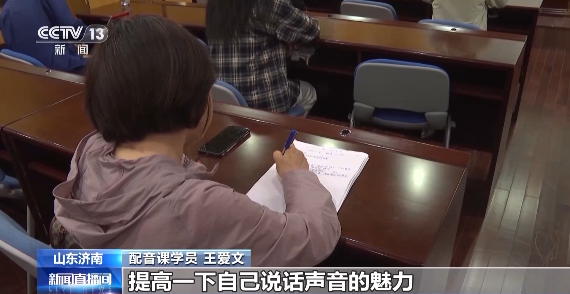 晚上7點,在濟南市圖書館舉辦的泉民夜校,一堂配音課正在進行。老師除了講解配音技巧,還現場帶着學員們練習,一對一指導。