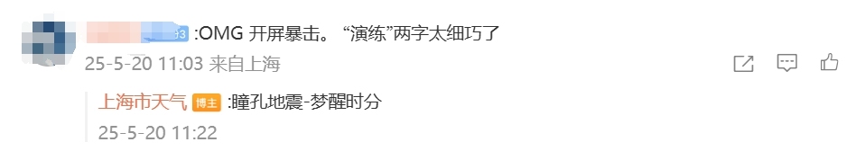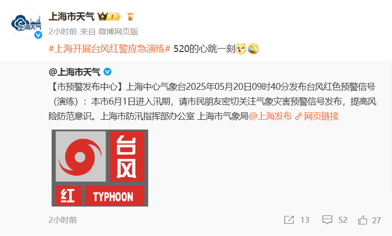 上海中心氣象台2025年5月20日09時40分發布颱風紅色預警信號(演練)。 @上海市天氣 截圖