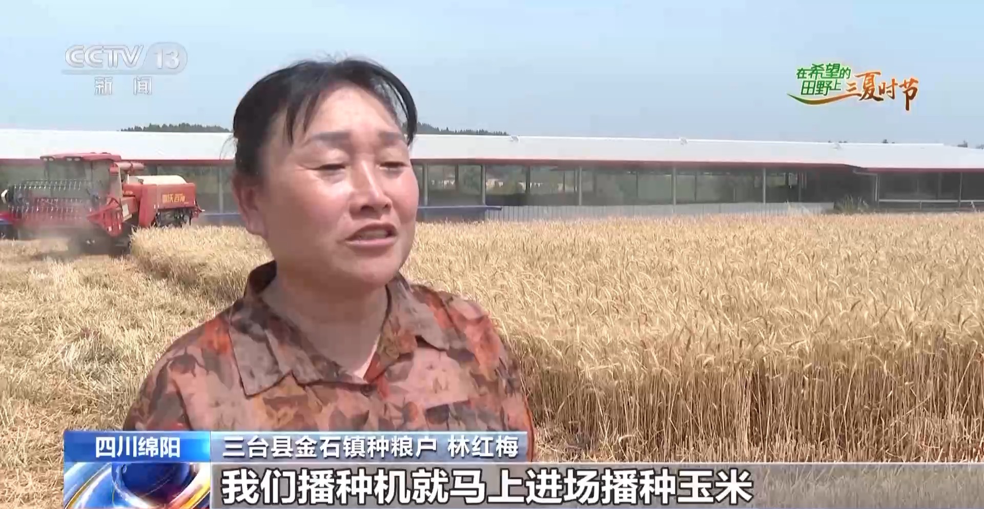 *三台縣金石鎮種糧户 林紅梅:*收一片小麥,我們播種機就馬上進場播種玉米,充分利用好土地良好的墒情,提高農業生產效率。預計我們2000餘畝小麥搶收在一個星期完成,玉米和水稻播種同步完成。