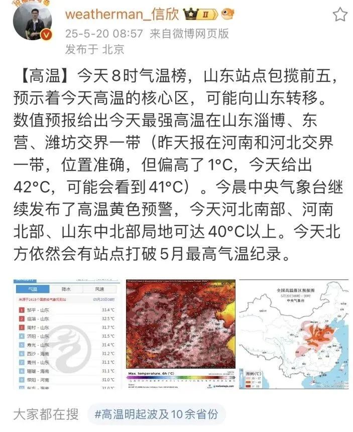 據中國天氣網提供的氣象數據,截至昨日16時,全國共有99個國家級氣象站點的最高氣温追平或刷新當地5月氣温極值紀錄,主要集中在河南、陝西、山西、河北、甘肅、寧夏等地。高温排行榜前十名被河北、河南兩省包攬,而且氣温均超過41℃。