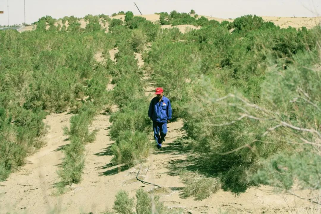 塔克拉瑪干沙漠的烈日下,塔里木零碳沙漠公路4號水源井管護工李偉蹲在沙丘旁,指尖輕輕撥開了一叢紅柳的枝葉。眼前,紅柳細密的綠芽從地下鑽出,沾着沙粒,在風裏顫巍巍地晃。
