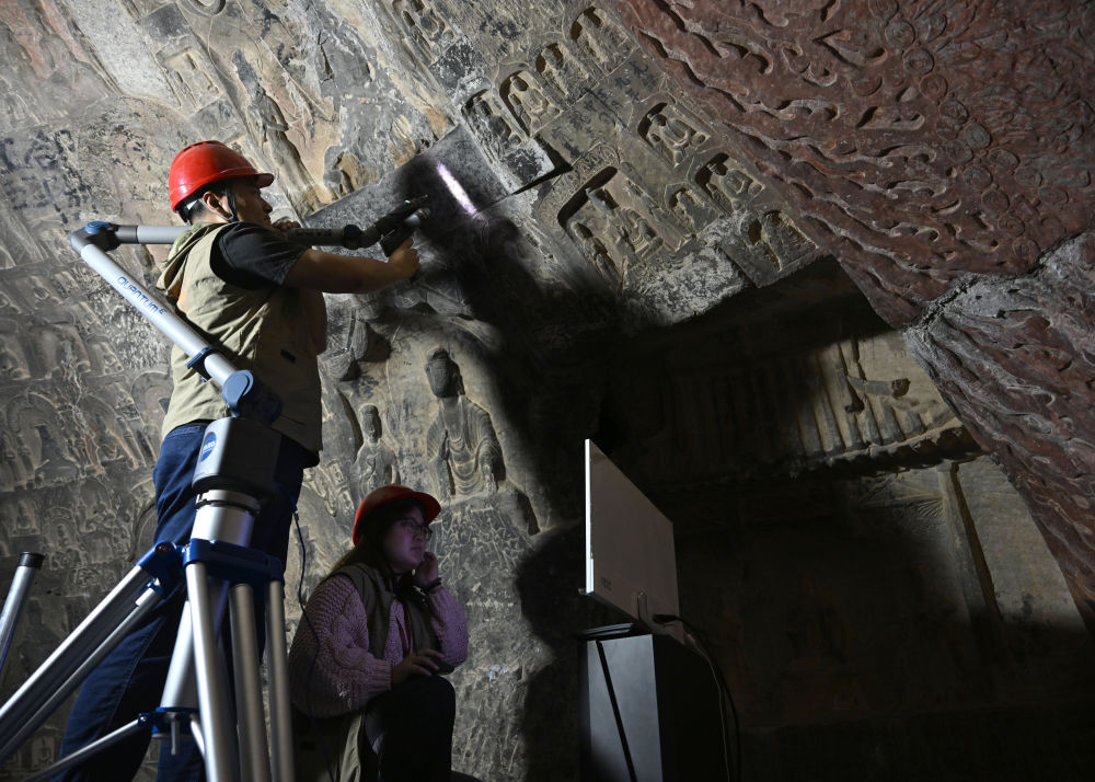 2025年4月9日,龍門石窟研究院工作人員在古陽洞使用關節臂掃描儀對像龕進行數字化掃描。