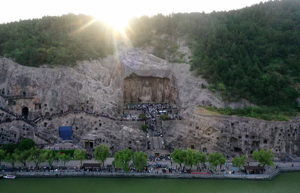 2025年4月24日,遊客在龍門石窟遊玩(無人機照片)。