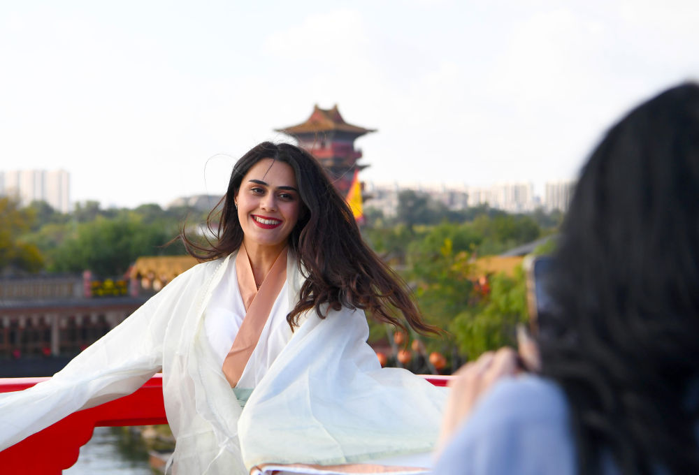 2024年10月18日,外國遊客在清明上河園內遊玩。