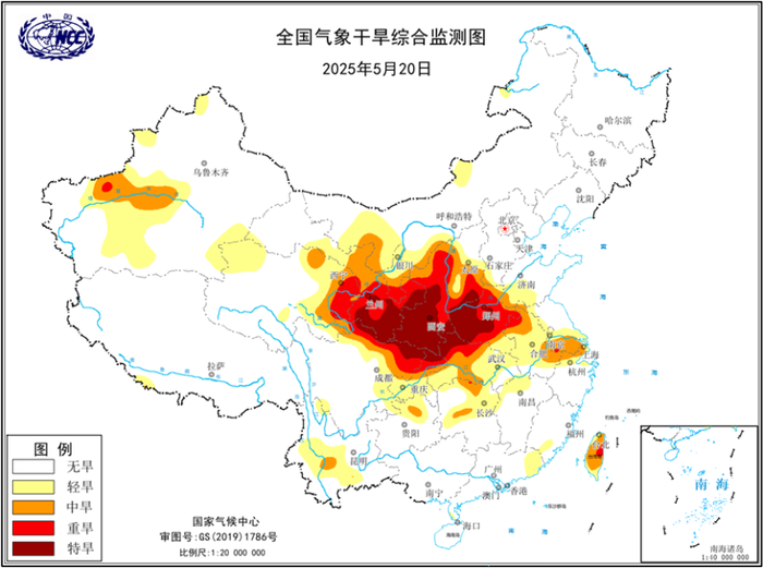 中央氣象台5月20日18時繼續發佈氣象乾旱黃色預警:
