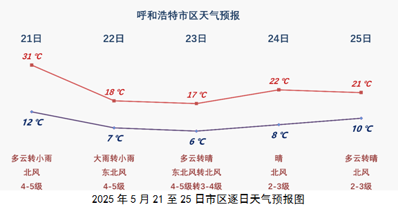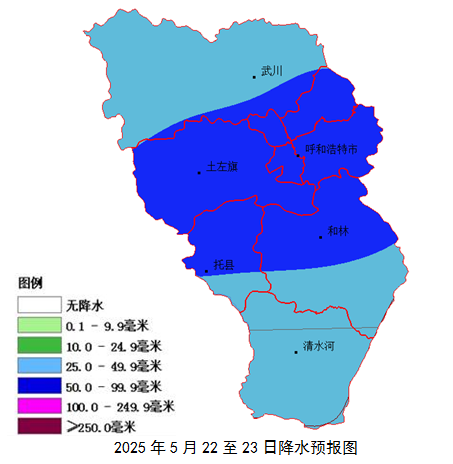 *降雨:*22日早晨至23日早晨,全市大部地區有大雨,累積雨量25~45mm,其中市區、土默特左旗、托克托縣中北部及和林格爾縣中北部雨量偏大,可能超過50mm。