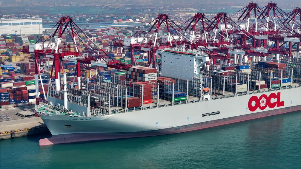 4月10日,一艘集裝箱貨輪在山東港口青島港前灣集裝箱碼頭進行裝卸作業(無人機照片)。新華社記者 李紫恆 攝