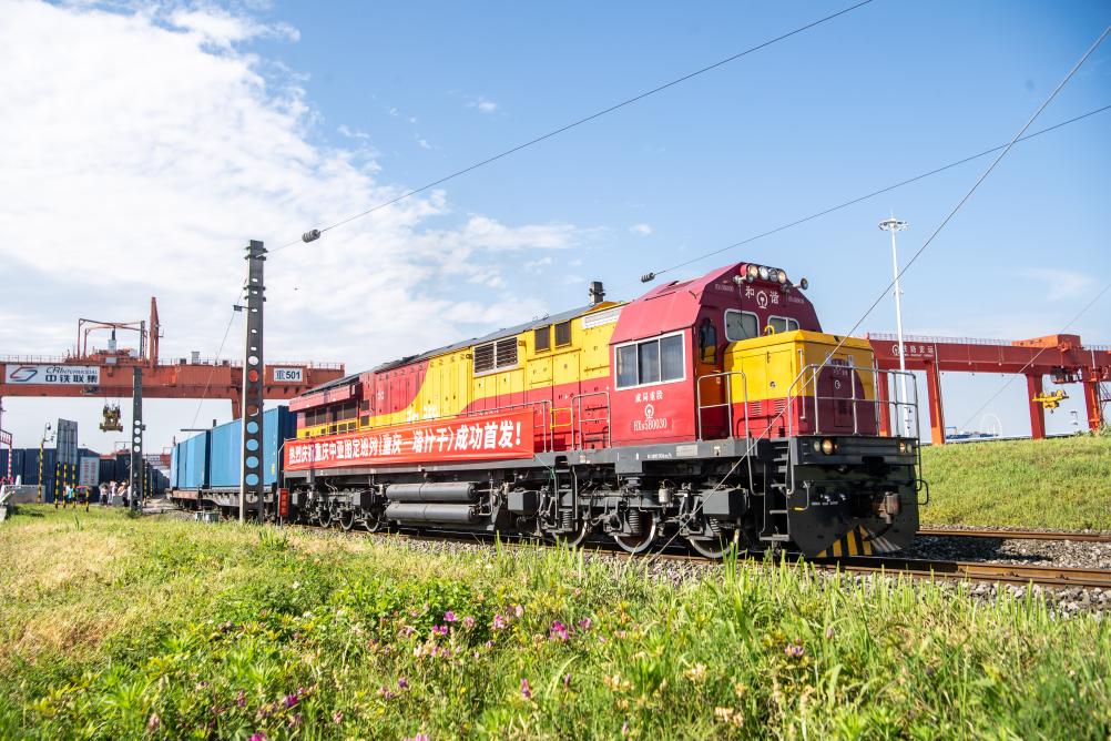 4月20日上午,一列滿載“重慶造”聚酯切片的中亞班列,從重慶團結村中心站緩緩駛出,這是重慶首次開行圖定中亞班列,此後將以每月2列的固定頻次實現常態化開行。新華社記者 唐奕 攝