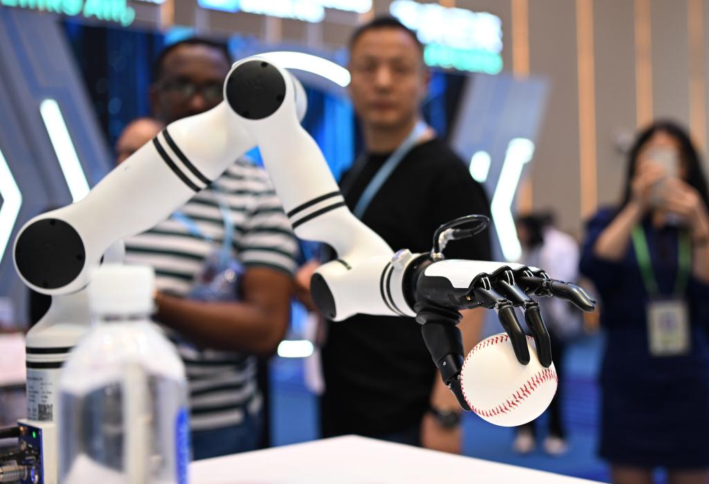 2025年4月15日,在第137屆廣交會服務機器人專區,機械臂展示靈巧手功能。新華社記者 鄧華 攝