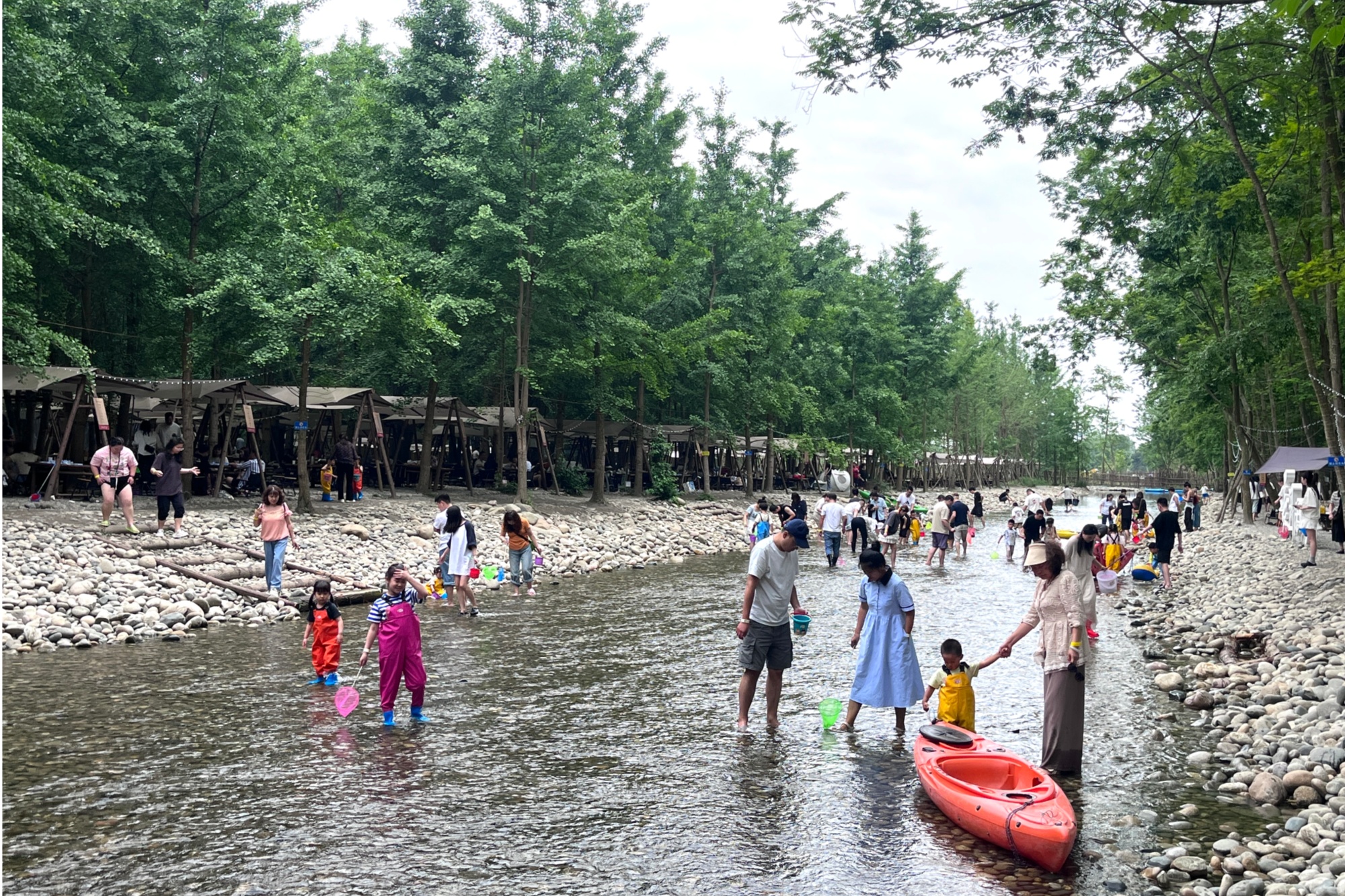下午1點鐘,工作人員向小河裏投放了螃蟹、烏龜等,吸引眾遊客紛紛踏入水中,滿心歡喜地帶着小朋友們一起感受緊張刺激的“捉捕野趣”。