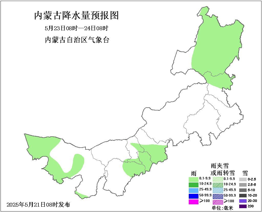 23日08時至24日08時,西部大部、中部偏西和東北部地區多雲間晴,阿拉善盟西北部和東南部、鄂爾多斯市東北部、包頭市南部和東部、呼和浩特市、烏蘭察布市中部和南部、興安盟北部、呼倫貝爾市大部地區有小雨,其餘地區晴間多雲;西部偏東和東北部地區4、5級西北風。