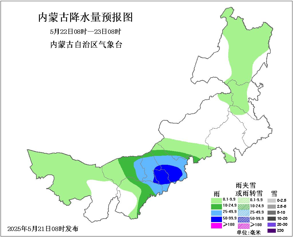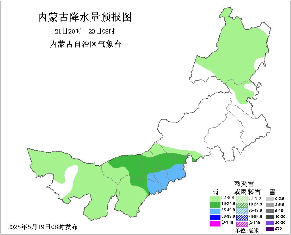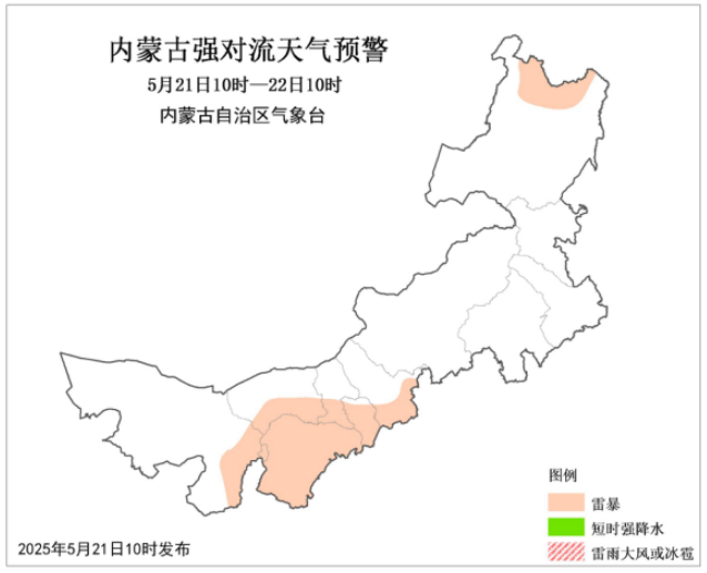 內蒙古自治區氣象台2025年5月21日10時發佈強對流藍色預警:預計5月21日10時至22日10時,阿拉善盟東南部、巴彥淖爾市南部、烏海市、鄂爾多斯市、包頭市南部、呼和浩特市大部、烏蘭察布市南部、呼倫貝爾市北部有雷暴天氣。
