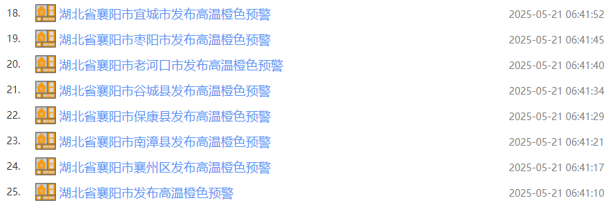 5月21日6時41分,襄陽市氣象台發佈高温橙色預警信號:預計今天白天,襄陽市區及各縣市大部分鄉鎮(街道)最高氣温將升至37℃以上,局部39℃以上,請注意防範。