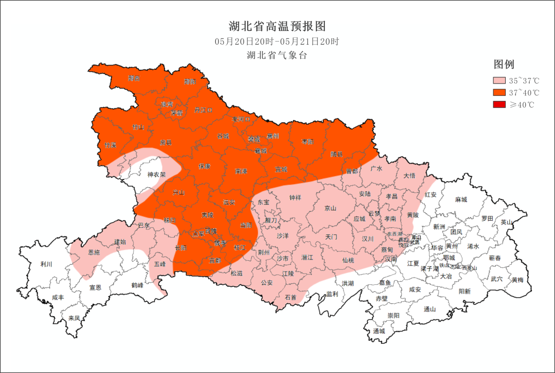 5月20日15時20分,湖北省氣象台發佈高温橙色省級預警: