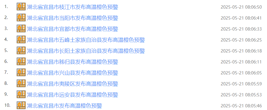 5月21日8時5分,宜昌市氣象台發佈高温橙色預警信號:預計今天白天,宜昌沿江河谷、低山及平原地區大部鄉鎮最高氣温將升至37℃以上,局部可達39℃以上,請注意防範。