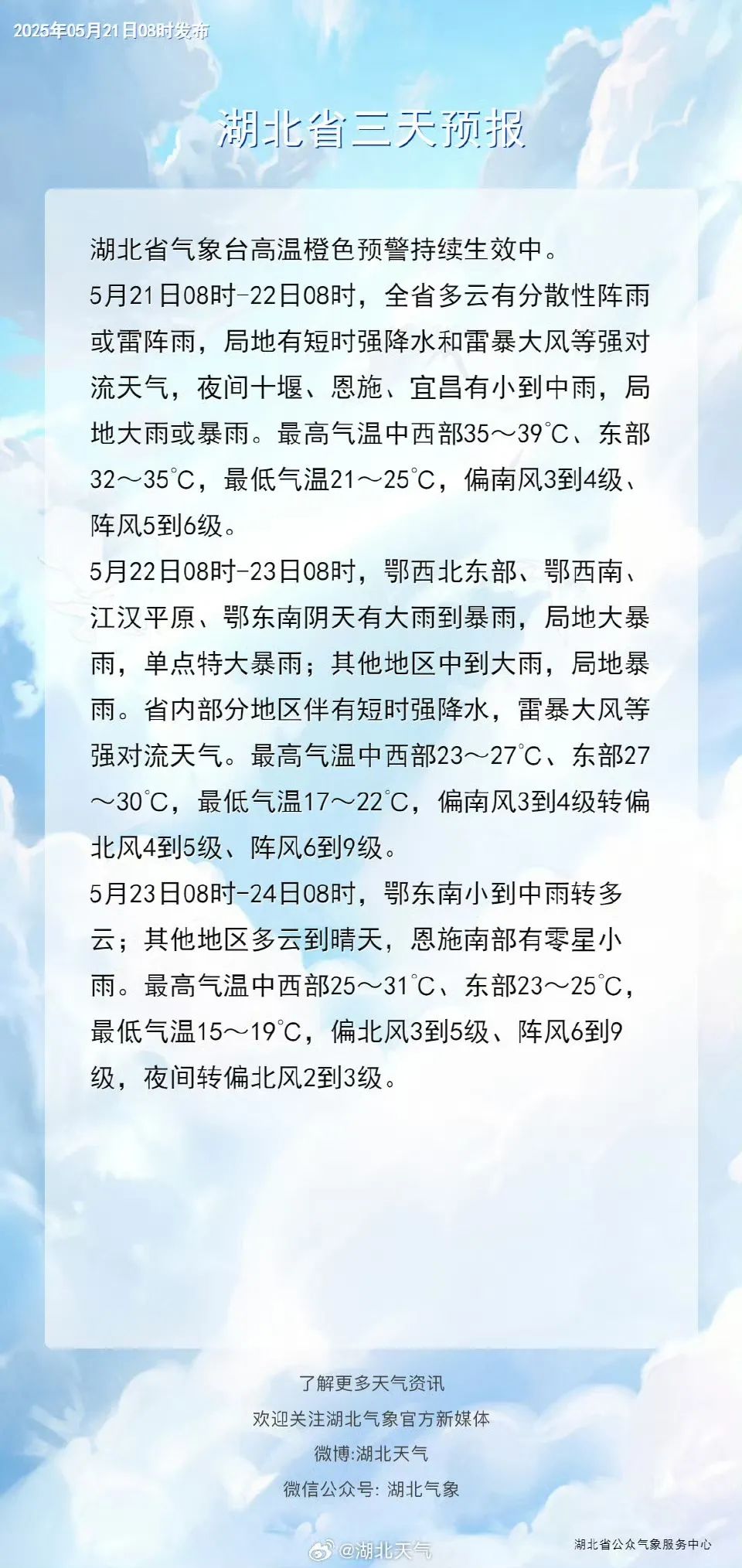 預計5月21日白天,十堰、襄陽、宜昌、恩施北部、荊門、荊州西部、隨州、孝感、武漢、潛江、天門、仙桃等地最高氣温將升至35℃以上,其中十堰、襄陽、隨州、宜昌可達37~39℃,局地40℃,請注意防範!