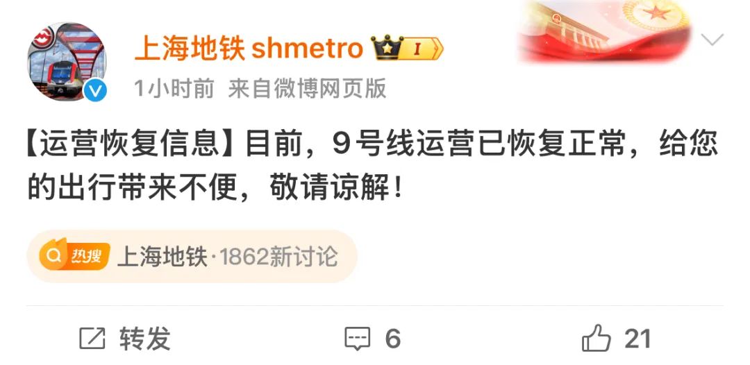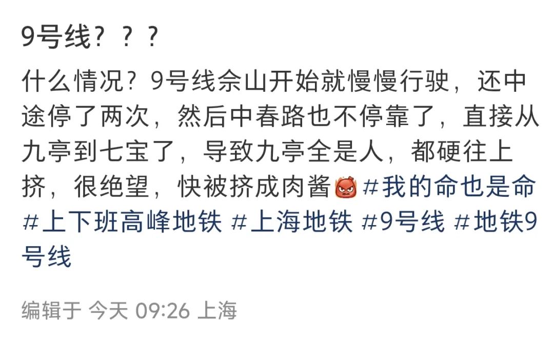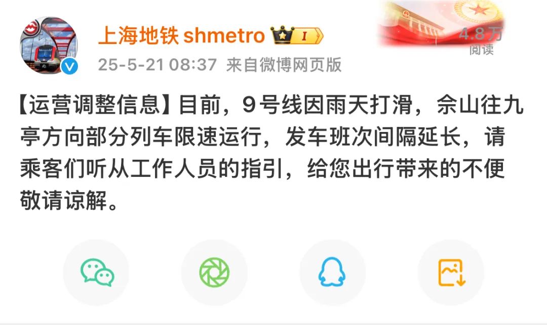 9號線因雨天打滑,佘山往九亭方向部分列車限速運行,發車班次間隔延長,請乘客們聽從工作人員的指引,給您出行帶來的不便敬請諒解。