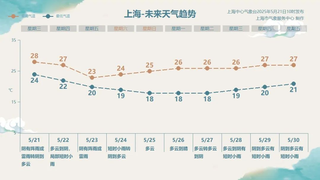 據1991-2020年徐家彙站氣候數據顯示,此時上海常年平均氣温為22.8℃,常年平均降水量為55.3毫米;節氣期間,上海暴雨預警明顯增多,最常見的氣象災害預警就是雷電、暴雨和大風。