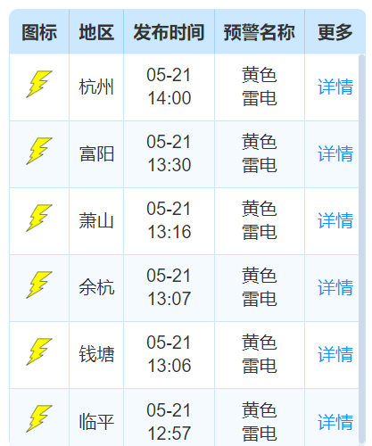 杭州多地發佈雷電黃色預警:
