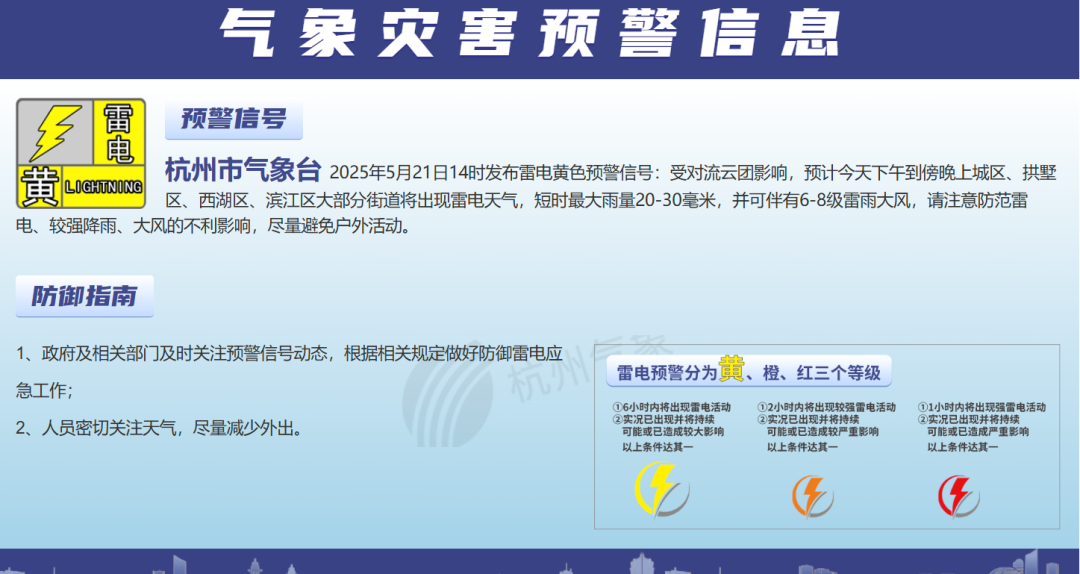 剛剛,杭州發佈雷電黃色預警:受對流雲團影響,預計今天下午到傍晚上城區、拱墅區、西湖區、濱江區大部分街道將出現雷電天氣。