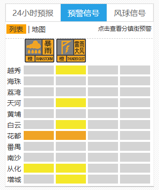 截至21日17時20分,廣州越秀、天河、白雲、花都、從化、增城區均發佈雷雨大風黃色或以上預警信號。