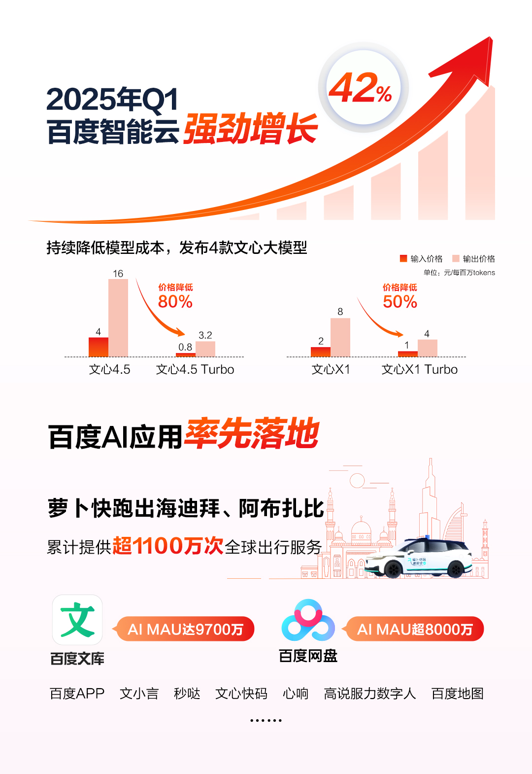 “智能雲業務表現強勁,凸顯市場對我們提供高性價比全棧AI產品及解決方案這一獨特優勢的認可度與日俱增。我們的無人駕駛出行服務也取得關鍵進展,蘿蔔快跑已拓展全球市場,進入迪拜和阿布扎比,彰顯了我們為全球市場提供安全、舒適和便捷無人駕駛出行服務的決心。”百度創始人李彥宏表示,“我們相信,AI-first戰略使我們能保持領先地位,在AI時代抓住長期增長機會。”